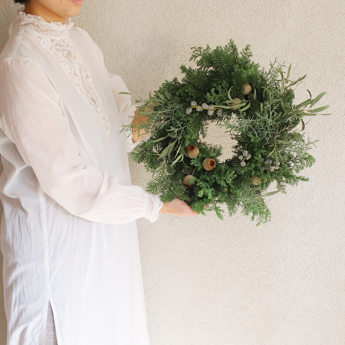 作り方レシピコクシニア・ヤシャブシ・モミを使ったクリスマスのスワッグ<おかえり>の作り方 – 土と風の植物園。