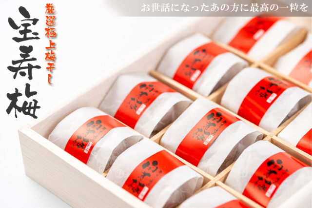 お歳暮ギフト 高級 梅干し 宝寿梅 20粒 A級品 個包装メッセージ 造花付き木箱入り 和紙包み 紀州杉使用うす塩仕上げ 完熟梅塩分10%。