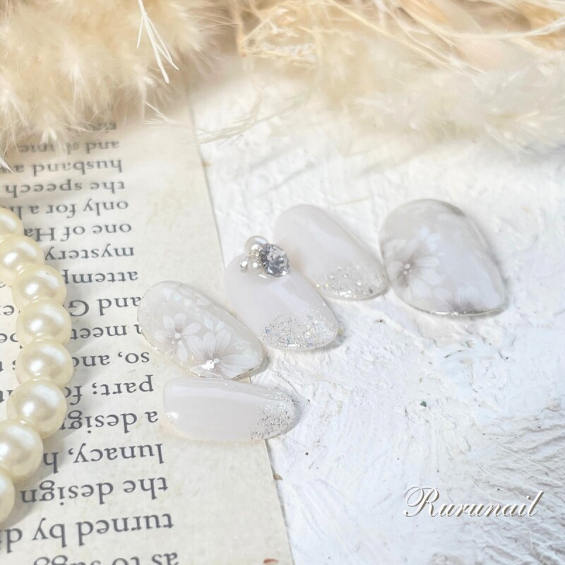 ホワイトグレーとフラワーの大人ブライダルネイルチップ 131- ネイルチップ通販Ruru nail。