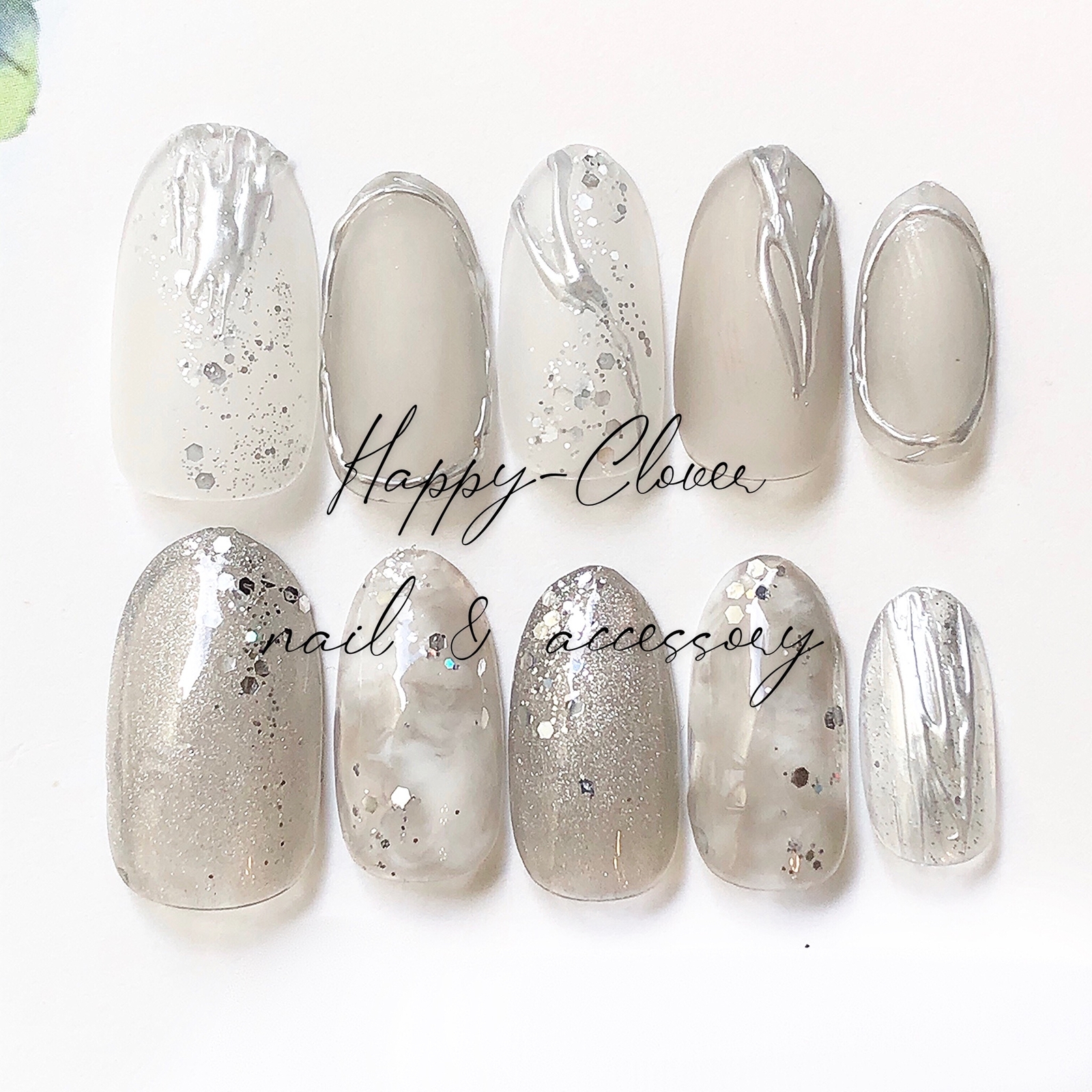 ネイルチップ シルバーグレーのアシンメトリーニュアンスネイル ブライダルネイル 結婚式 成人式ネイル - happy-cloverminnebyGMOペパボ 国内最大級のハンドメイド・手作り通販サイト。