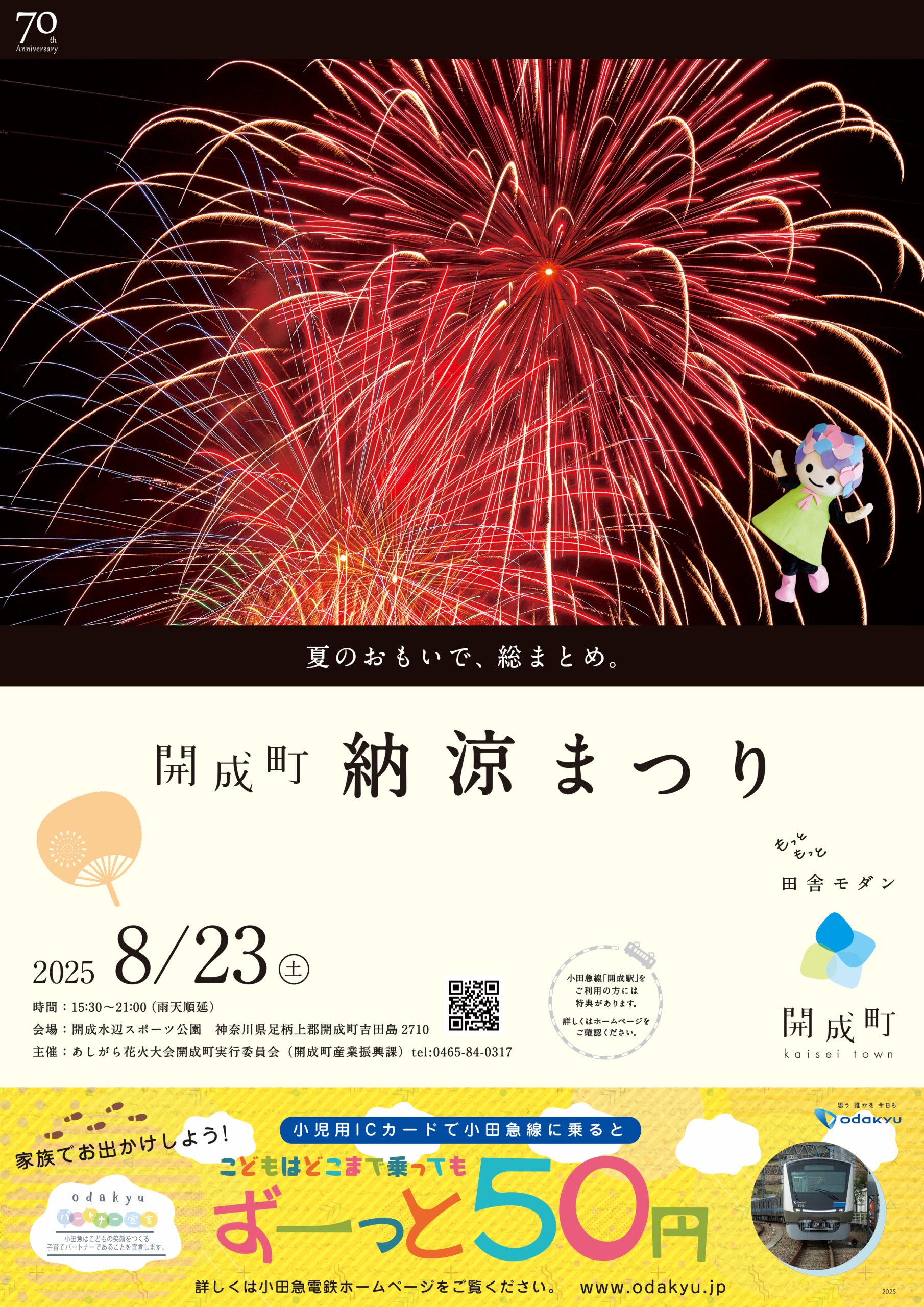 チラシダウンロード できます - 開成町納涼まつり夏おもいで、総まとめ河原でのんびり、笑う1日。フィナーレはほぼ真上に打ちあがる迫力の花火。夏のおもいでがギュッと詰まった1日です。