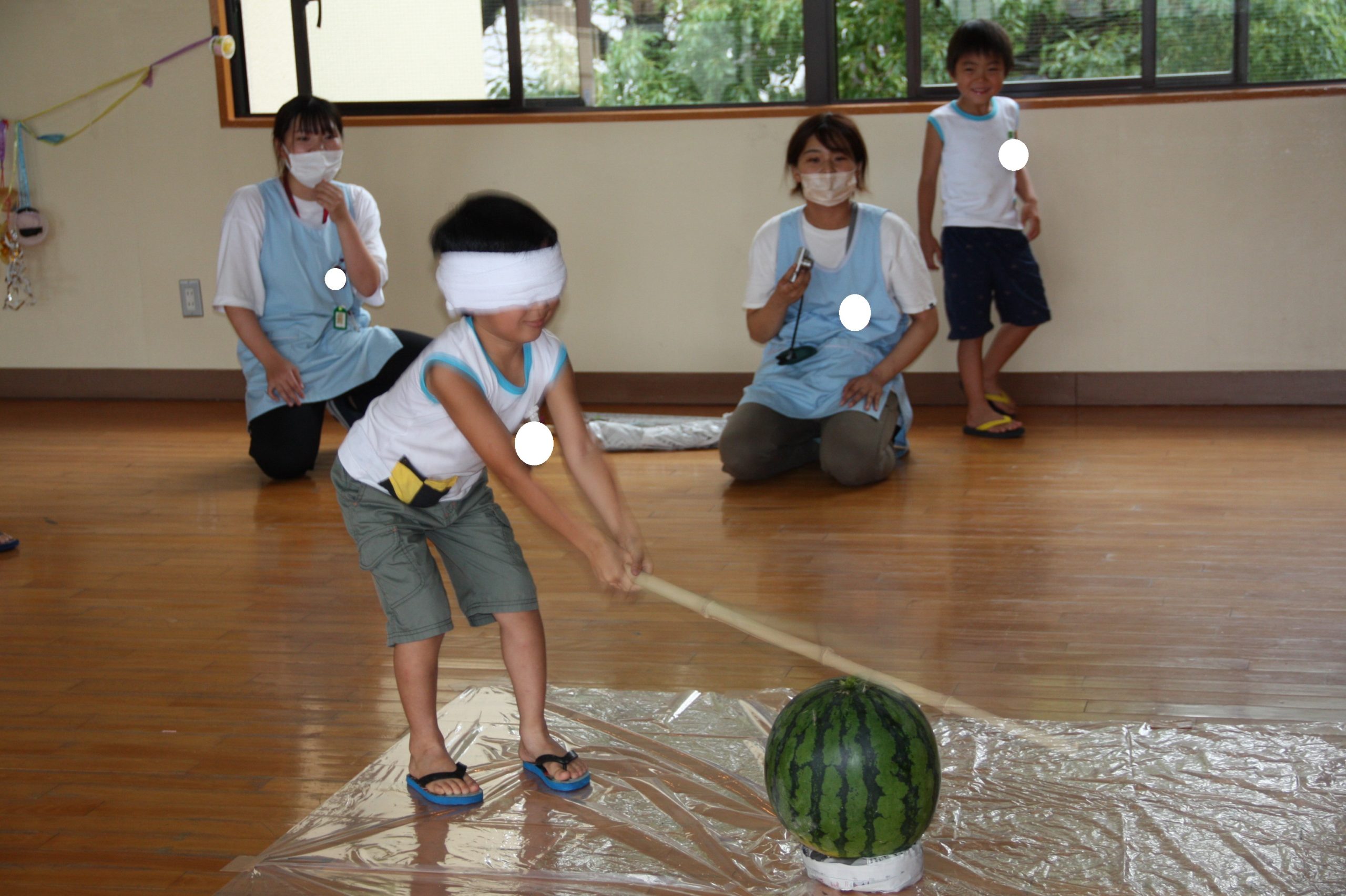 スイカ割りに挑戦する子どもたちの様子。