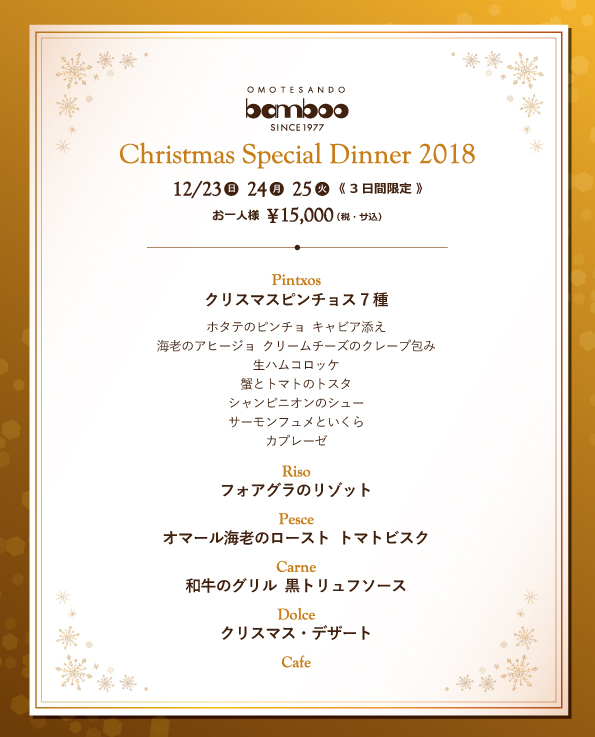 12 23-25 3日間限定クリスマスディナーのご案内2018 Since1977表参道bamboo ColumnTOPICS。