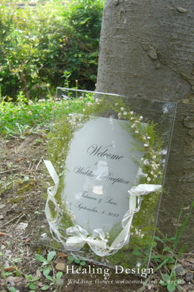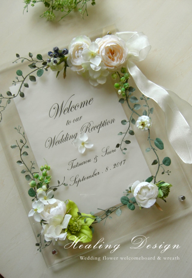ウェディング フラワーボード クリアー&ホワイトフラワー ウェディングボード 結婚祝 ウェルカムボード メッセージ 人気ウェルカムボード販売のHealingDesignヒーリングデザイン。