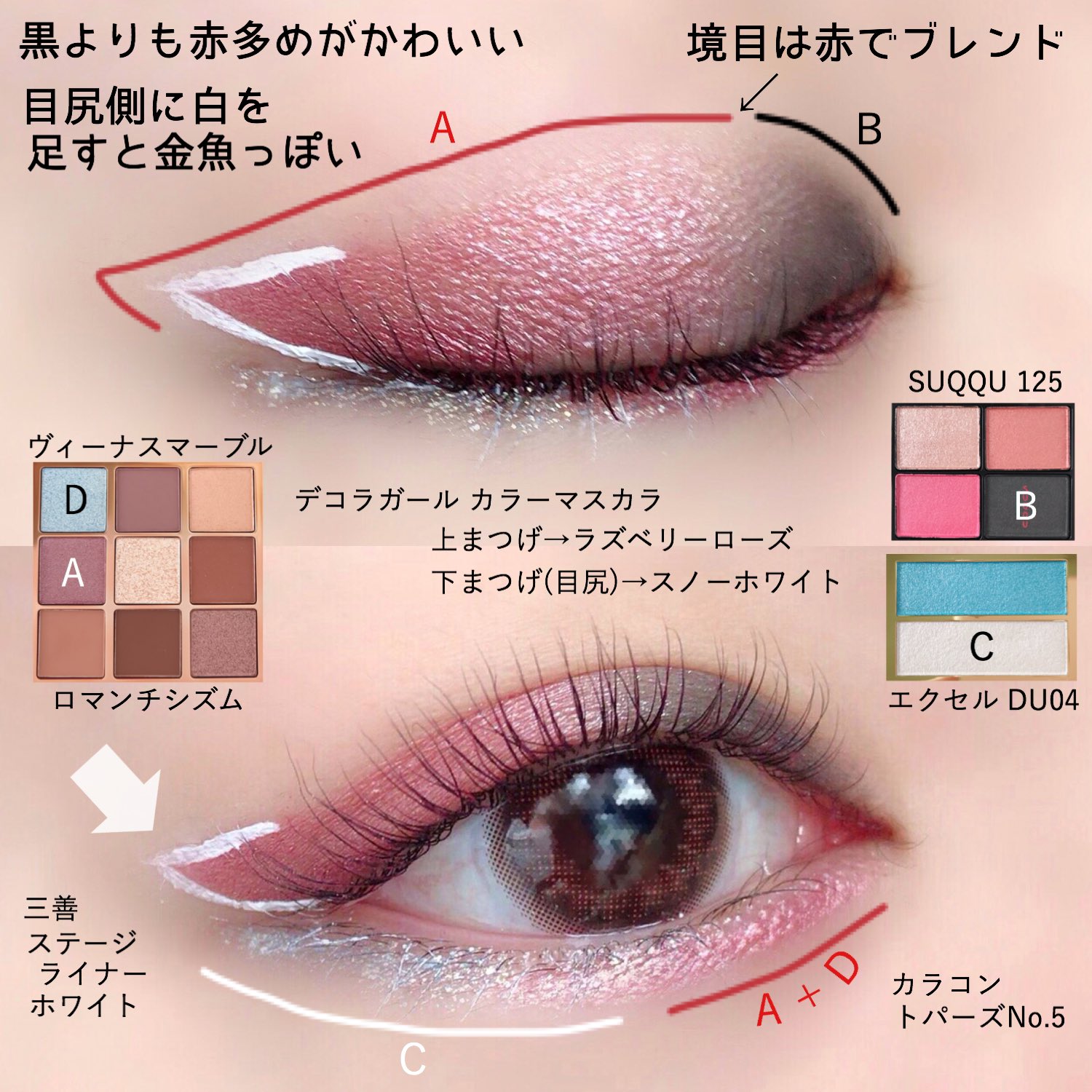 ちこえ on X: "夏祭りメイク 金魚金魚にも色々な種類がありますが、赤・黒・白が揃うと、分かりやすく金魚感が出ます。このメイクは6:3:2の比率を想定して塗りました。割合はお好みで。ヒレが欲しかったので、白のライナーはくの字に引いてみました。手の震えも風情。