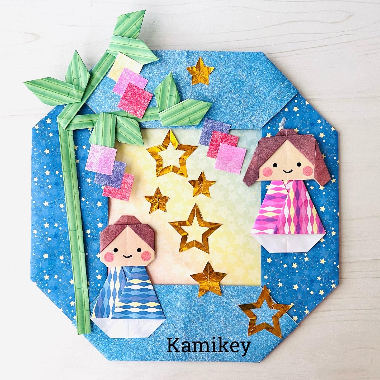七夕リース . 2つ七夕のリース作ってみました🎋⭐️ 1枚目はカミキィさんの季節のおりがみより短冊を追加したものです❣️もう1枚は月間おりがみの中から田中具子さんの笹の葉と竹、スイカ🍉と天の川は宮本真理子さんの本を参考にしています😊 .origami ORIGAMI 介護。