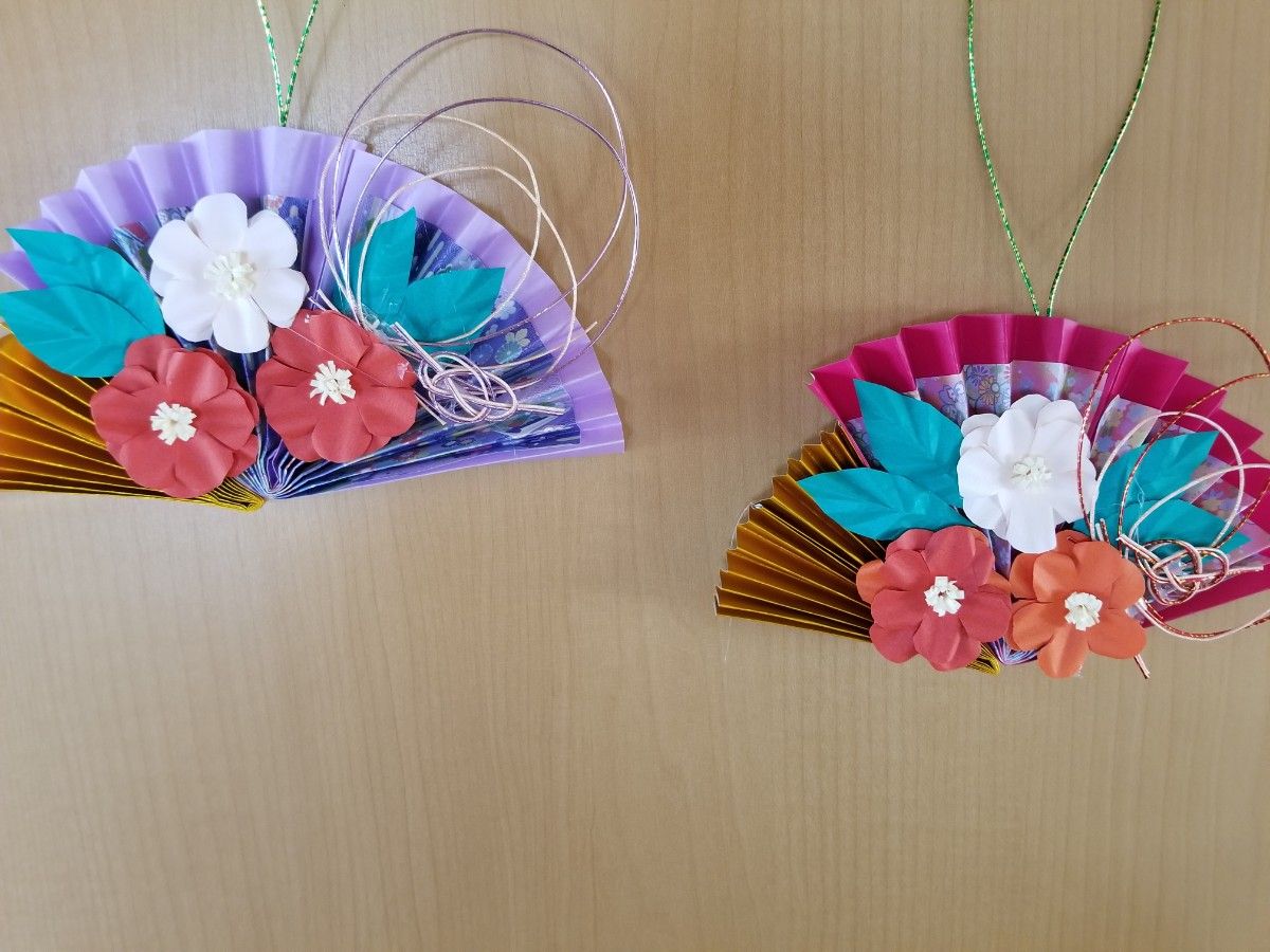 折り紙扇型正月飾りリース2点セット椿値引き。