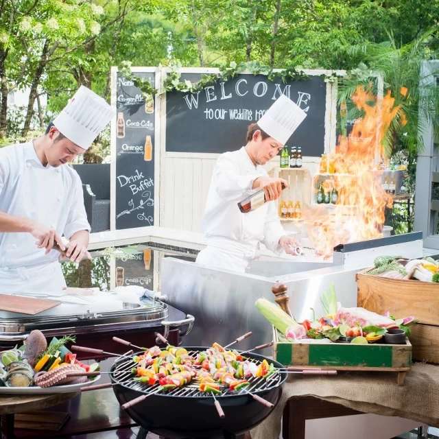 こんなのアリ?!BBQウェディング🍖✨こんなウェディング見たことありますか?😳 シェフたちがテラスで新鮮な魚介や拘り野菜、贅沢なお肉を香ばしく焼き上げて、 ゲストの皆様に振る舞うBBQウェディング!✨ 思い出に残ること間違いなし!😏 ゲストの皆様と近い距離で。
