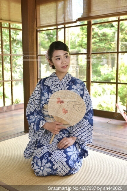 夕涼み、浴衣の後ろ帯に団扇の写真素材79842850- PIXTA。