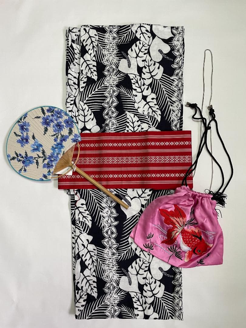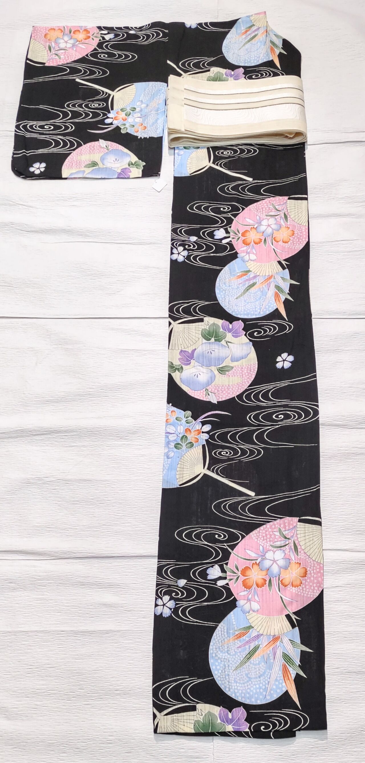 ゆかた うちわ柄 黒地 伝統的な浴衣 紺地うちわ柄 に赤い帯?半幅帯。