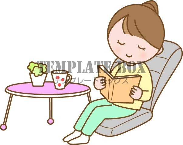 休日に自宅で本や雑誌などを読みながらゆったりとリラックスして過ごす女性無料イラスト素材TemplateBox。