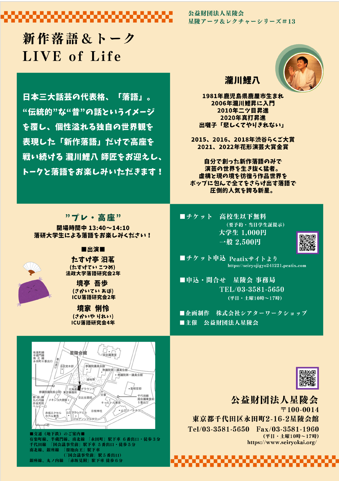 星陵アーツ&レクチャーシリーズ#13 新作落語&トーク『 LIVE of Life 』。