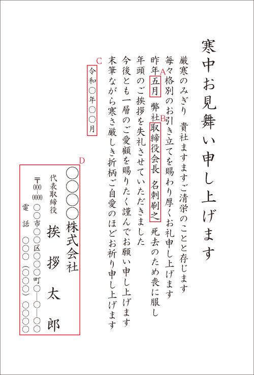 挨拶状 寒中見舞い、喪中の場合、喪中に頂いた返信ビジネス文書クリップ。