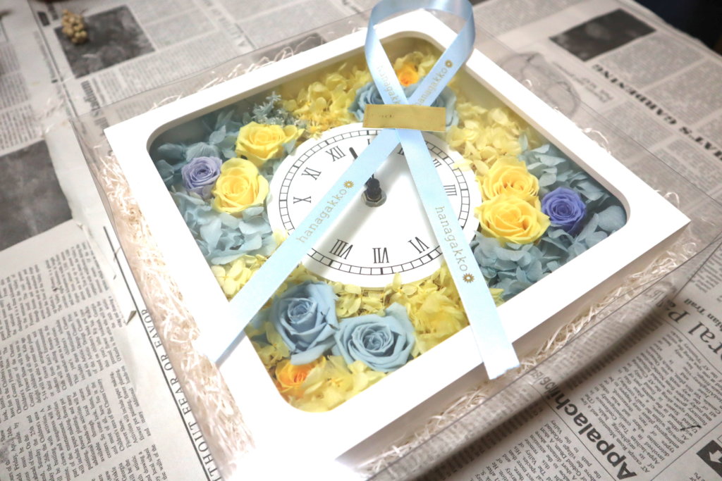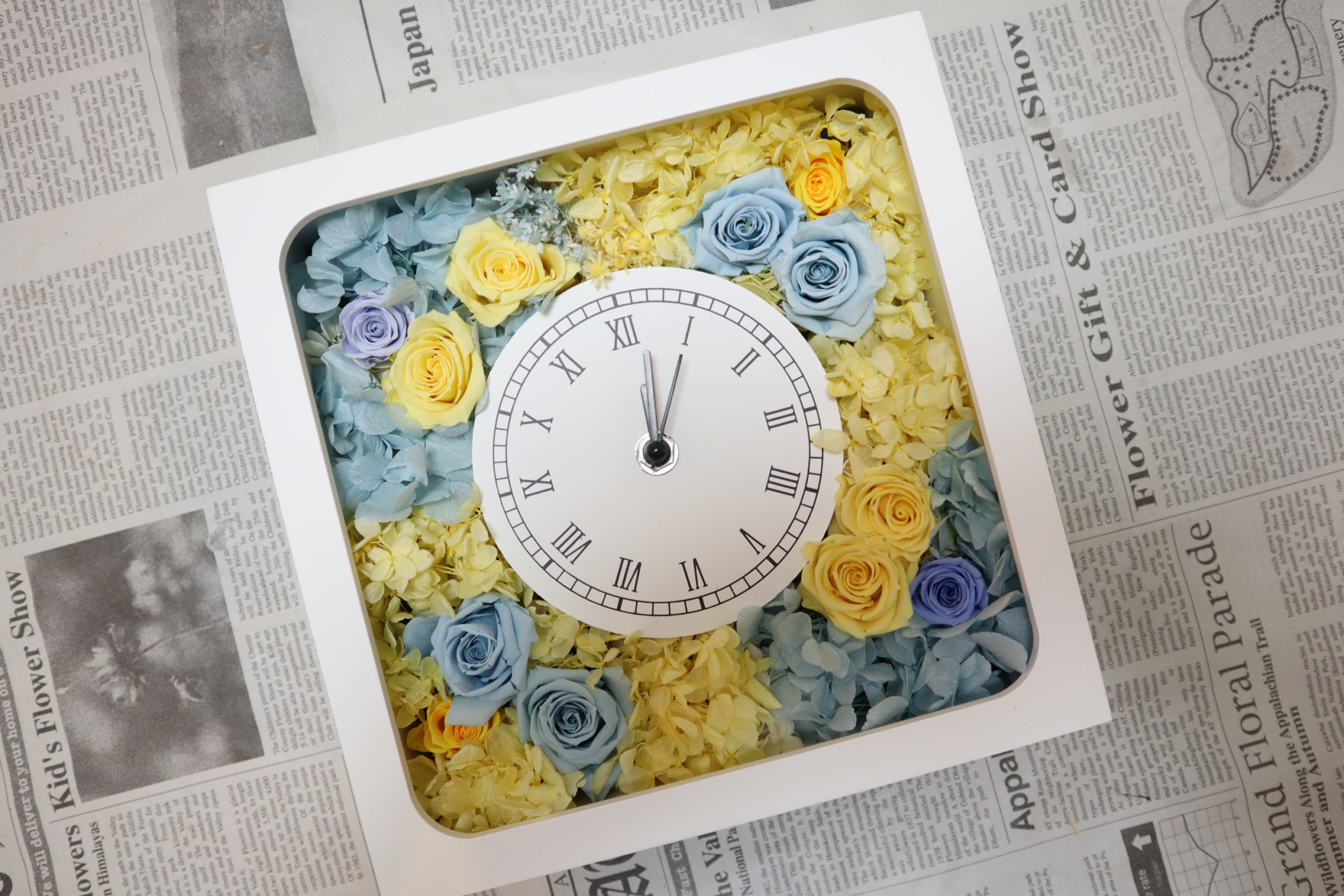 手作りのプレゼント!結婚式での新婦様へのサプライズに黄色とブルーで時計を作られました!東京・表参道・青山プリザーブドフラワーアレンジメント教室「花学校」初心者でも1回でおしゃれに手作りする!お花レッスン。