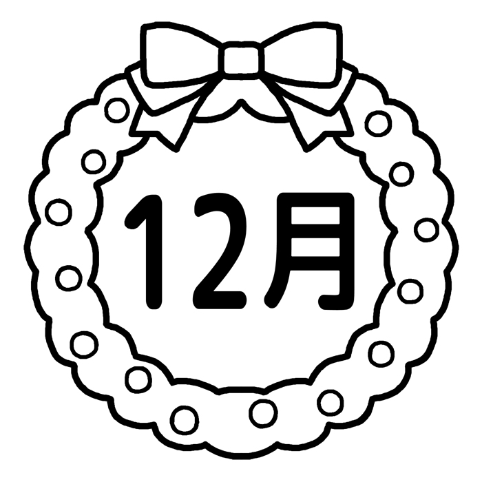 クリスマスリース 白黒12月タイトルの無料イラスト 冬の季節・行事素材。