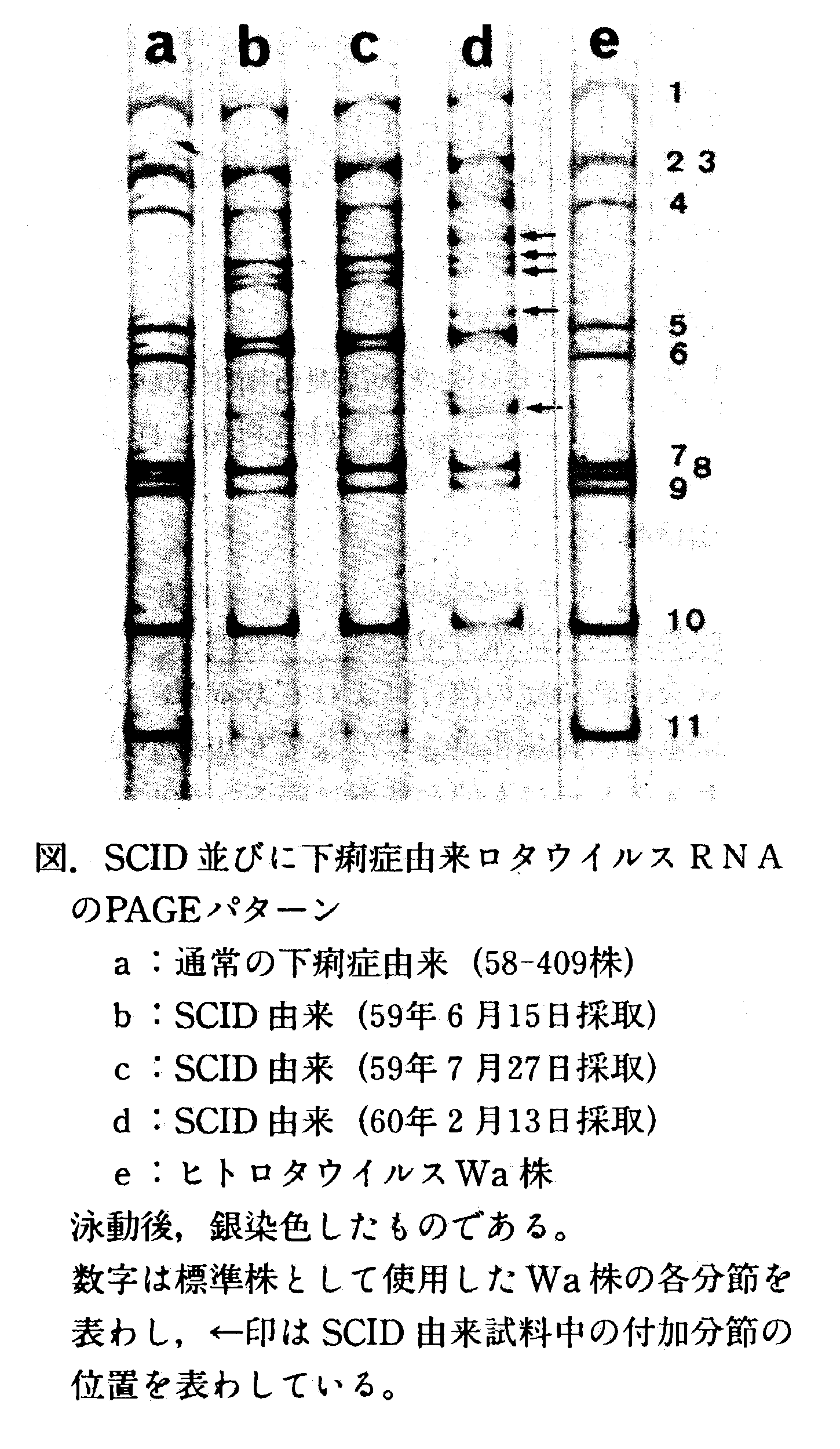 図.SCID並びに下痢症由来ロタウイルスRNAのPAGEパターン。