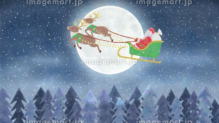 トナカイのそりにのるサンタさんと雪の夜の背景 かわいいクリスマスイラスト230039342- イメージマート。
