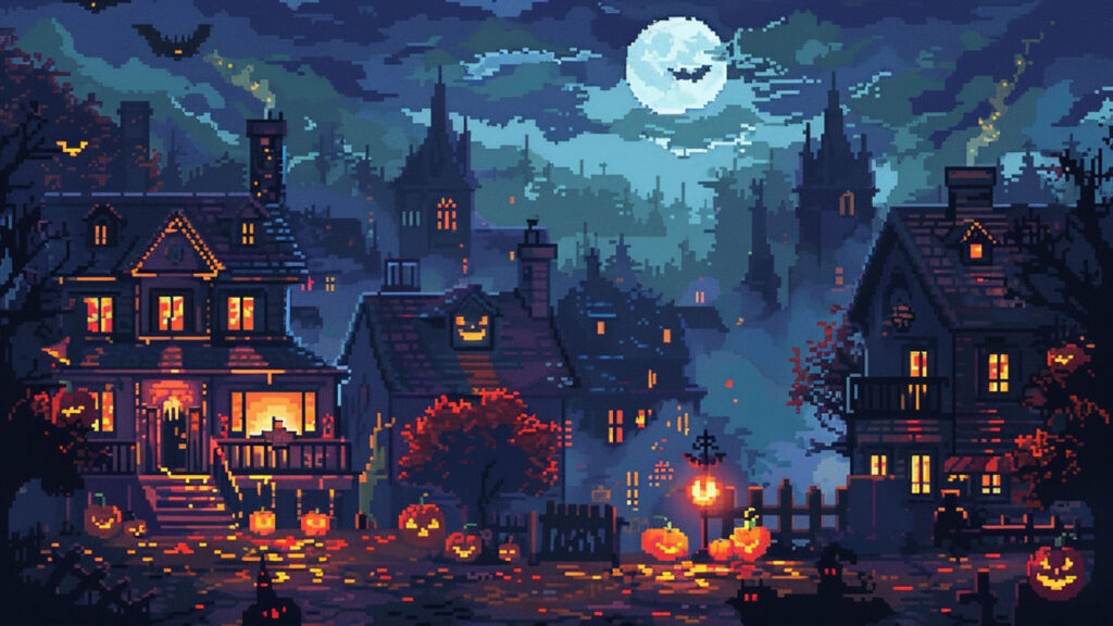 フリー素材 ハロウィンの街並みドット絵 5枚。