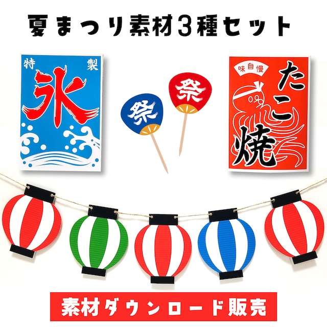 ダウンロード販売 夏まつり素材3種セット 提灯ガーランド+祭りうちわピック+かき氷&たこ焼きポスターHAPPY BIRTHDAYCRAFTS ハピバクラフト 〜誕生日の飾り付けや手作りメッセージカードのお店。