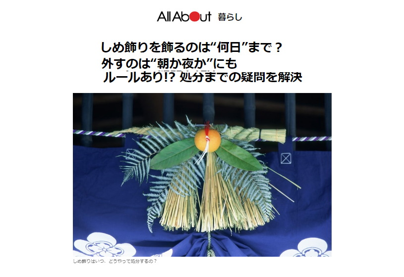 allabout しめ飾りを飾るのは“何日”まで?外すのは“朝か夜か”にもルールあり!? 処分までの疑問を解決 2024年01月02日。