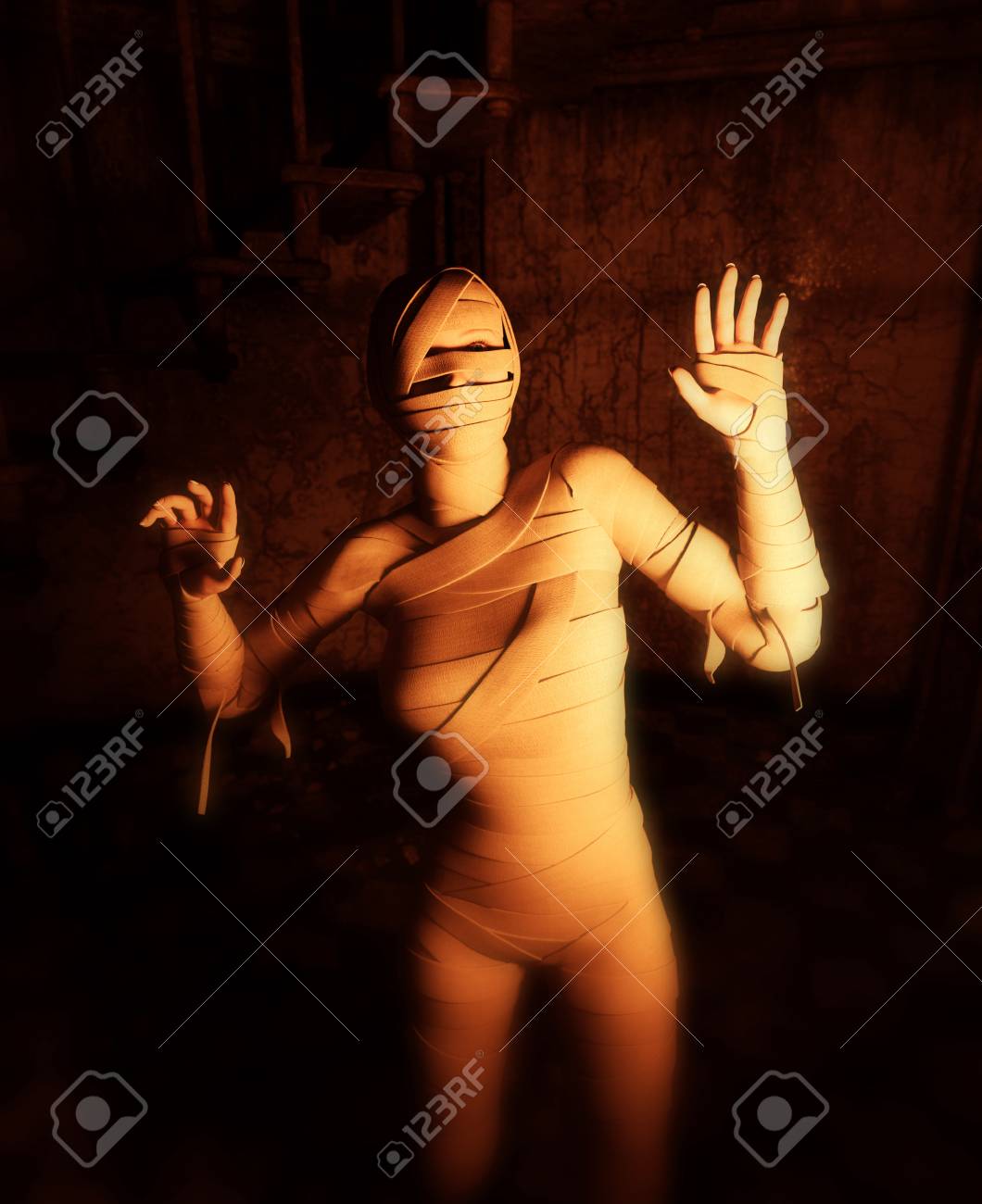 怖いミイラはあなたに忍び寄ります。包帯を持つ女の子が床に這う。ハロウィン衣装の写真素材・画像素材 Image 130611177。