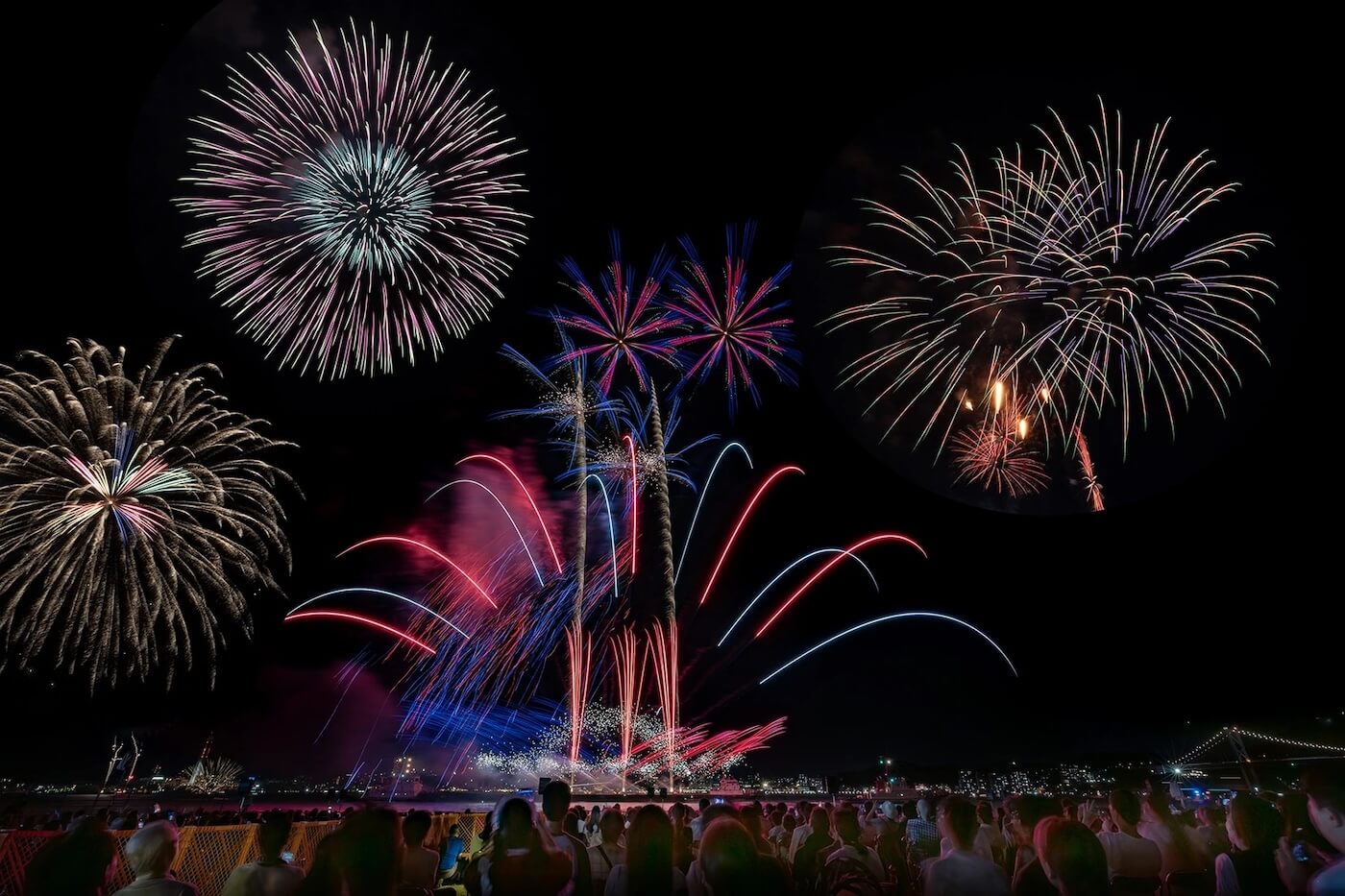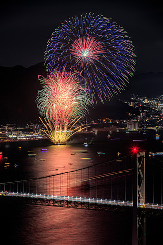 関門橋 手前 のそばで大輪の花火が夜空を彩った関門海峡花火大会=2019年8月、山口県下関市 多重露光- お盆の夜空彩る1万5000発の大輪関門海峡花火大会 - 写真・画像 1 1西日本新聞me。
