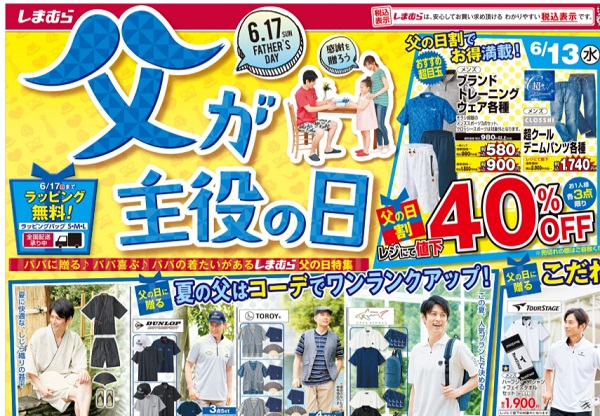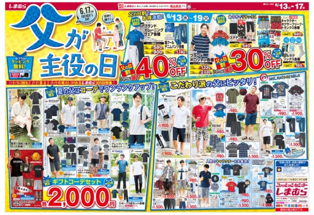 しまむら 最新チラシ情報 6 14~ 父の日コーデセットで「お父さんいつもありがとう!」HK WORKS LONDONほか海賊つうしん。