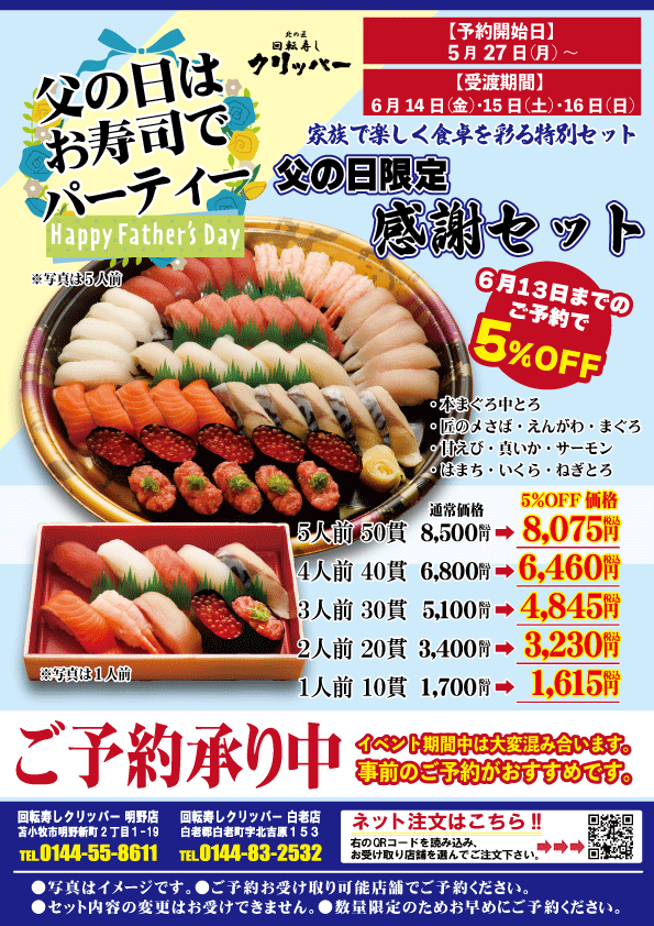 2024年06月 父の日テイクチラシ クリッパー 表 – 回転寿しの久恵グループ 久恵比寿回転寿しクリッパー・100円くりっぱー・旬楽苫小牧・恵庭・千歳・白老。