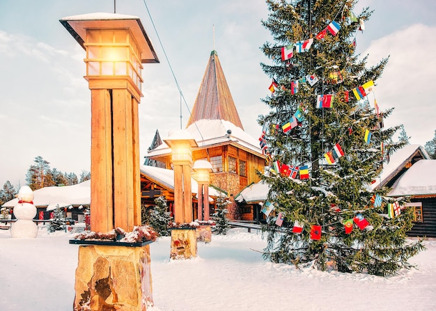 フィンランドのラップランドにあるロヴァニエミのサンタクロース村の街灯。Premium写真。