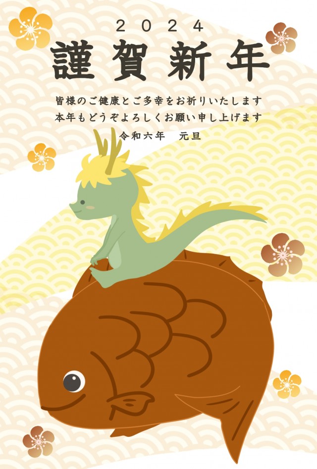 2024年 鯛のうえに乗る竜のいる年賀状テンプレート無料イラスト素材素材ラボ。