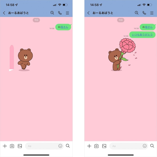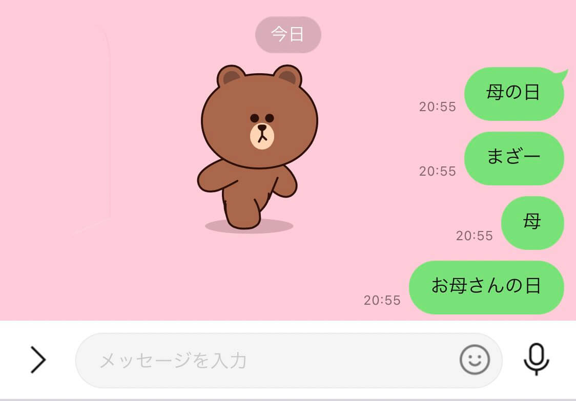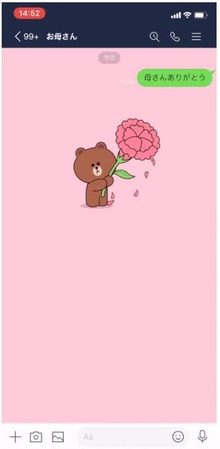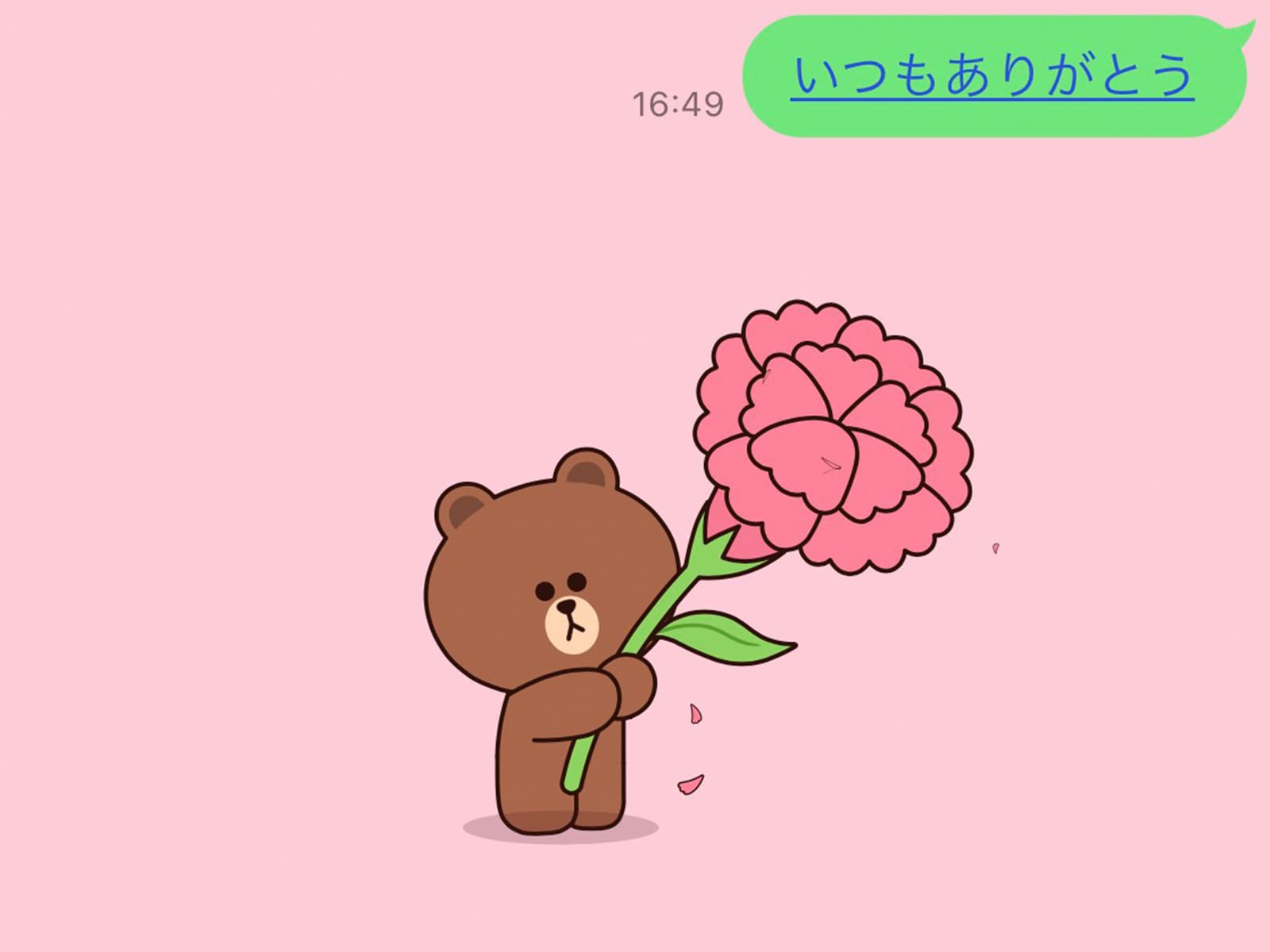 感謝の気持ちを伝えよう🌹 今年も「母の日」のアニメーションが登場☀️ 5月といえば 「母の日」 LINEのトークルーム背景にブラウンがカーネーションを渡してくれる 可愛らしいアニメーションが出現中📱💕 トークルームで「いつもありがとう」や 「母さん」「母の日」と。