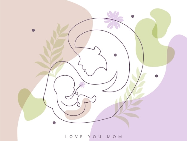 花と葉のカラフルな背景に抽象的な 1 つのライン アート イラスト幸せな母の日Premiumベクトル素材。