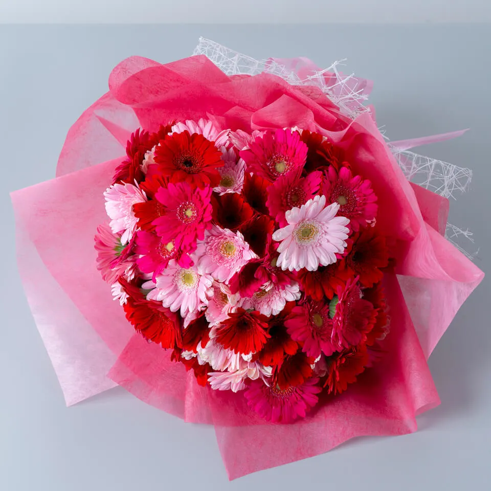 ガーベラのハート型花束~恋する花束・花夢ハート Come Heart~プロポーズ ・誕生日・結婚記念日・母の日・卒園入園祝い・卒業入学祝い・退任退職祝い・出産祝い・いい夫婦の日・長寿祝いにおすすめ送料一律1100円 ※一部地域を除く。