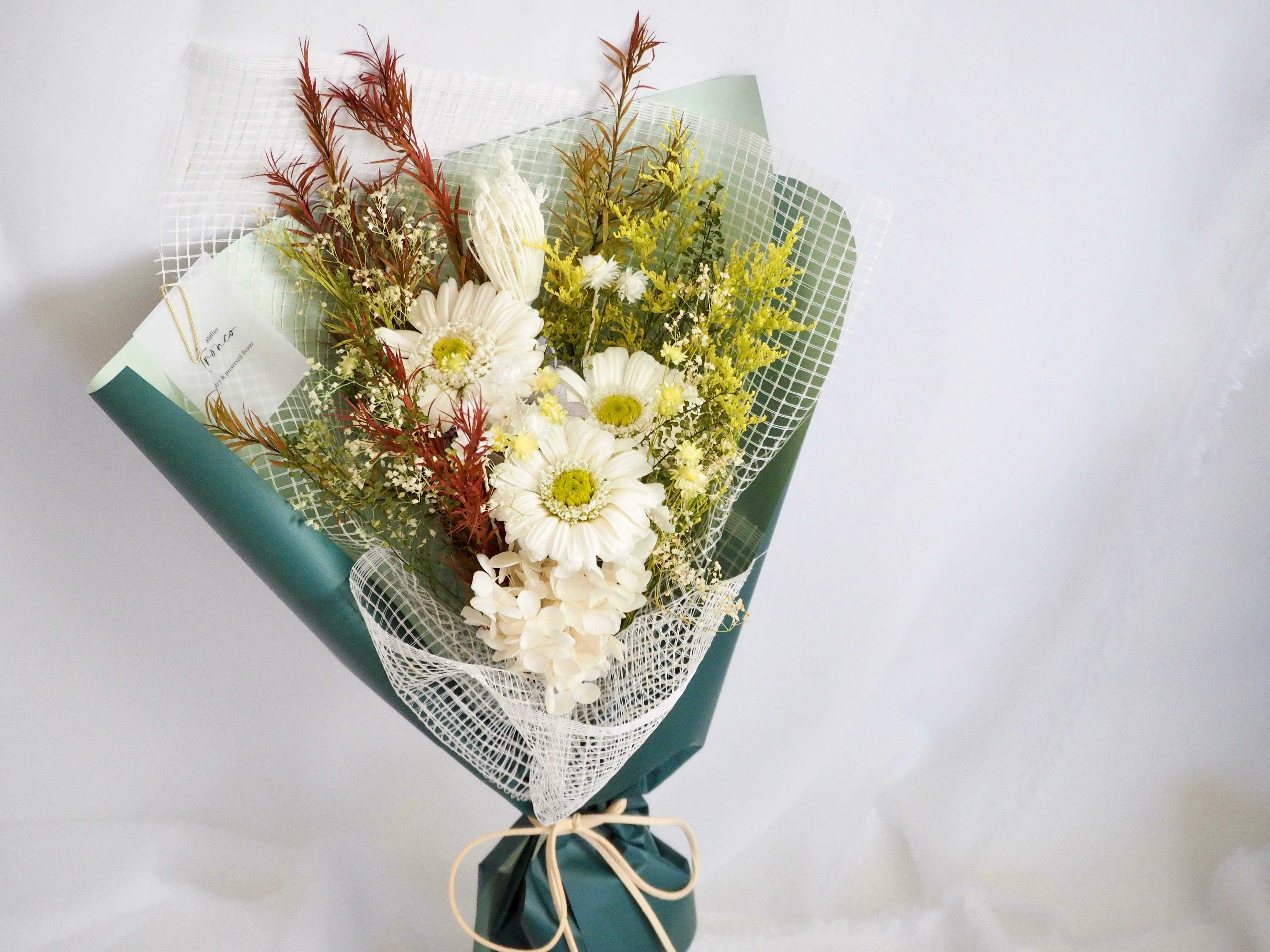 ガーベラのプリザーブドフラワー モダンスタイルな花束 bouquetatelier TRONCO ドライフラワーとプリザーブドフラワーのお店。