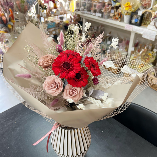 レッドとオレンジのバラ、ミニガーベラ、カーネーションの花束 台中エリア限定 - ショップ Healing flower designドライフラワー・ブーケ - Pinkoi。