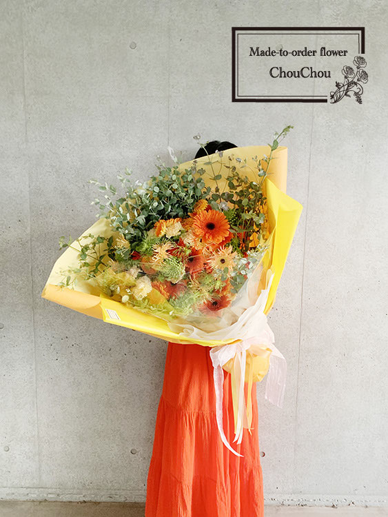 ガーベラとチューリップのおしゃれオレンジの花束プロポーズフラワーショップ。