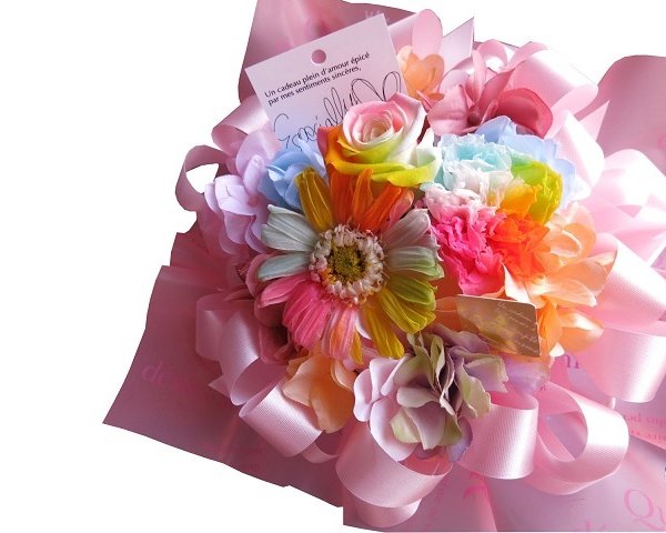 プリザーブドフラワー プレゼント スヌーピーハート 枯れない レインボーローズ レインボーガーベラ レインボーカーネーション 花束風 ハート。