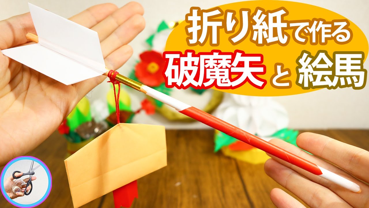 破魔矢と絵馬 折り紙で作る立体的な作り方・折り方動画を紹介!冬の1月、正月の飾を手作りで飾ってみてはいかがでしょう? つくるモン Hamaya andEmashigeyuki.net。