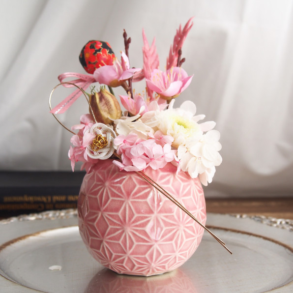 むぎデザイン工房 トピックス プリザーブドフラワー講座 ピンポンマムの雛祭りアレンジ。