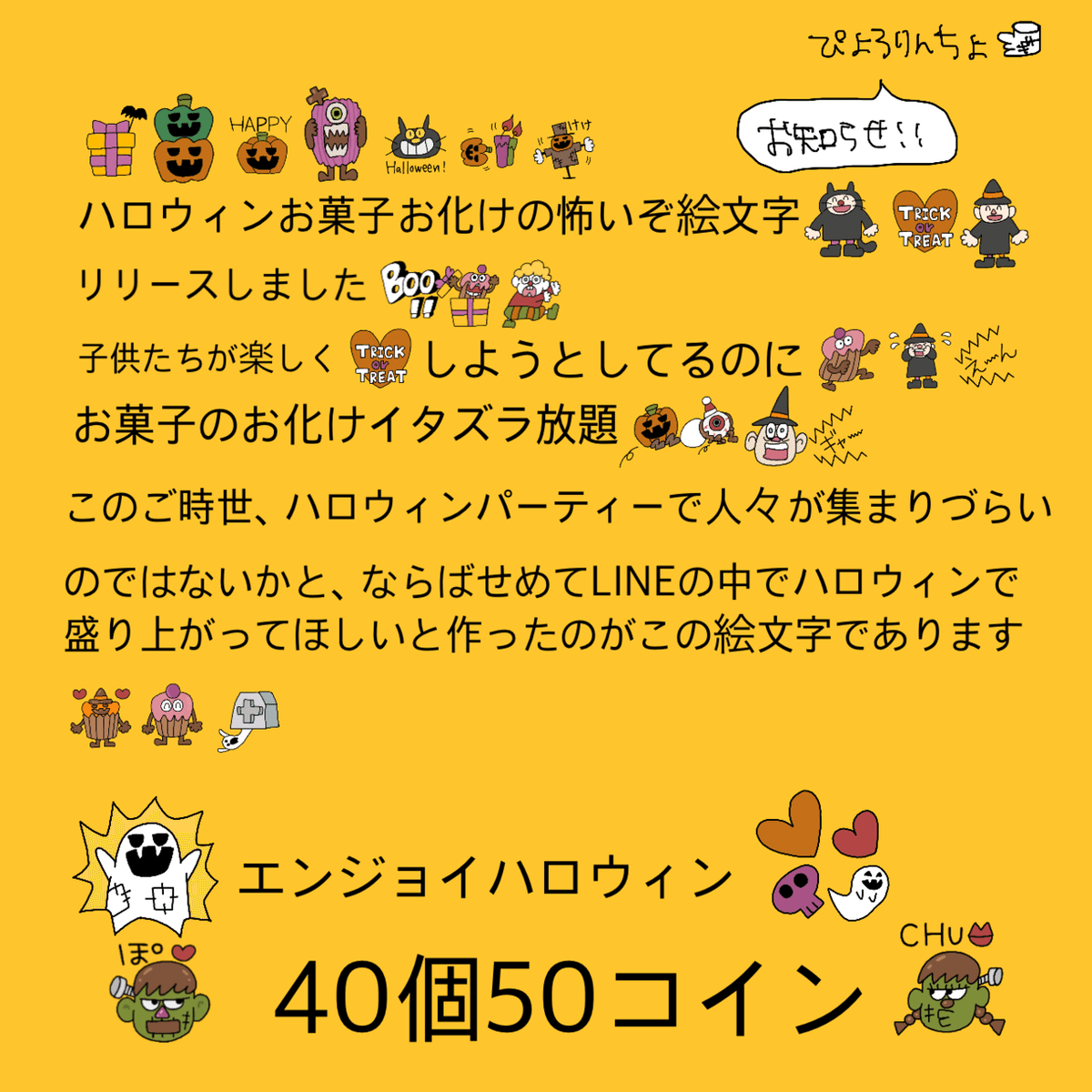 ハロウィン☆可愛い絵文字』 LINE絵文字40個セット 好評発売中‼️ 👻 LINEストアとLINEアプリ内スタンプショップで購入できます。うえはらかずよで検索してね❣️ 🎃 LINEストアはプロフィールのリンクから飛べます❣️ 👻 * trick or treat!可愛いモンスター達とお。