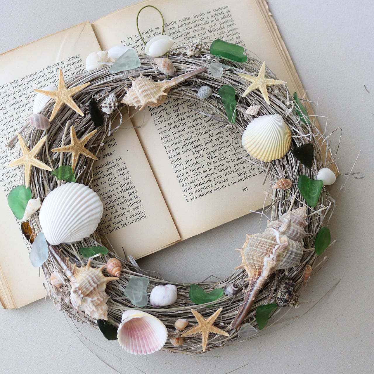 クリスマスリース 30cm ブルーゴールド 玄関 おしゃれ 北欧 手作り 1点もの ・ 玄関ドアOK♪ 貝殻とシーグラスの夏色リース I夏 玄関ドア用リース フラワーリース 北欧インテリア 開店祝い プレゼント 誕生日 ギフト グリーン ナチュラル かわいい ボタニカル。
