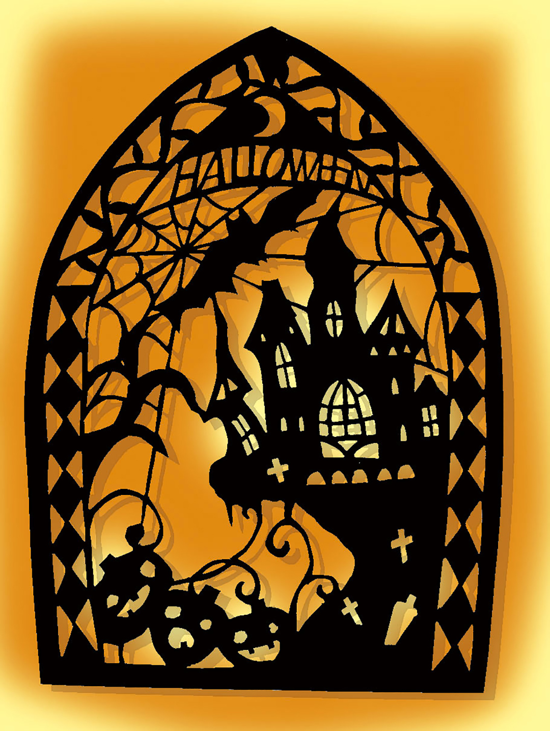 フリー図案No.265「ハロウィンのお屋敷」の切り絵華色切絵公式サイト。