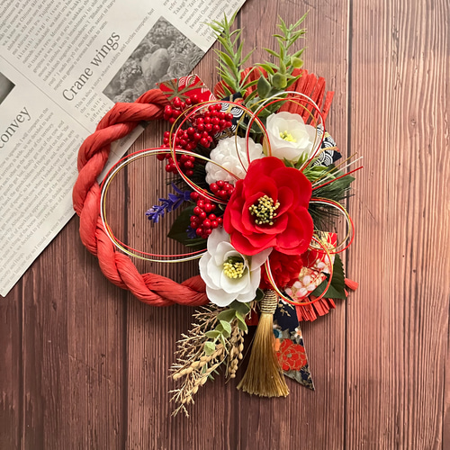 しめ縄飾り しめ縄リース 正月飾り 玄関リース 玄関飾り しめ縄 ハンドメイド フラワー・リース。