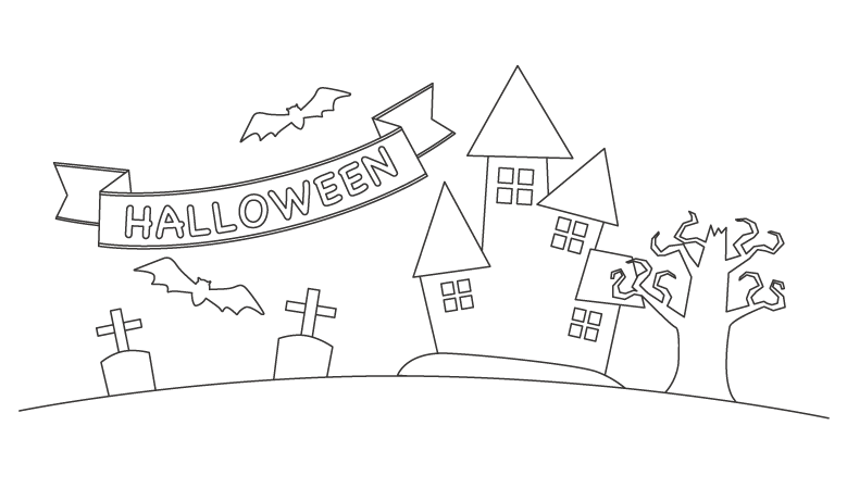 無料の「HALLOWEEN」の文字とお化け屋敷のぬりえぬりえパーク。