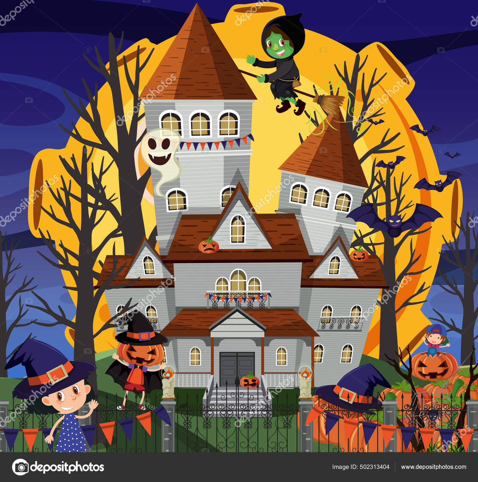 夜のイラストでハロウィンのお化け屋敷とシーン ストックベクター ©brgfx 502313404。