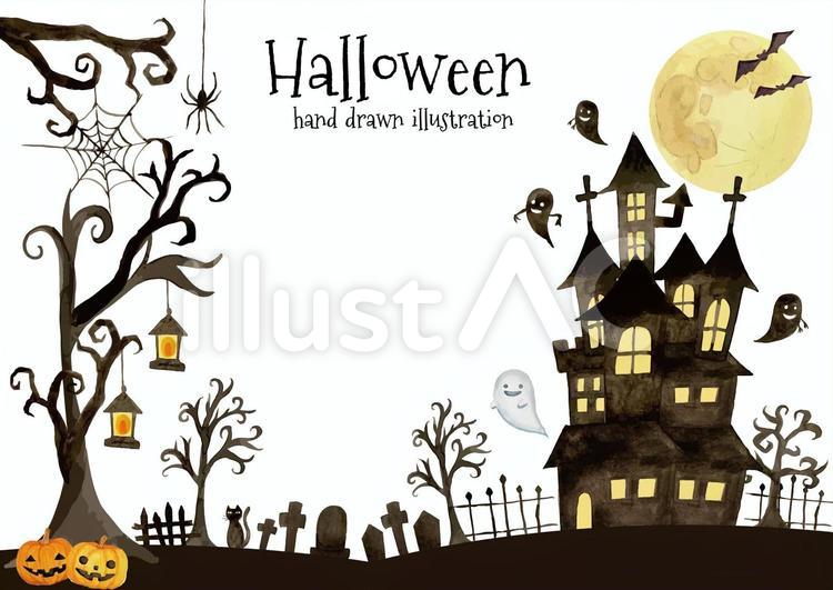 ハロウィン お化け屋敷のグリーティングカード イラスト 横商用フリー 無料 のイラスト素材なら「イラストマンション」。
