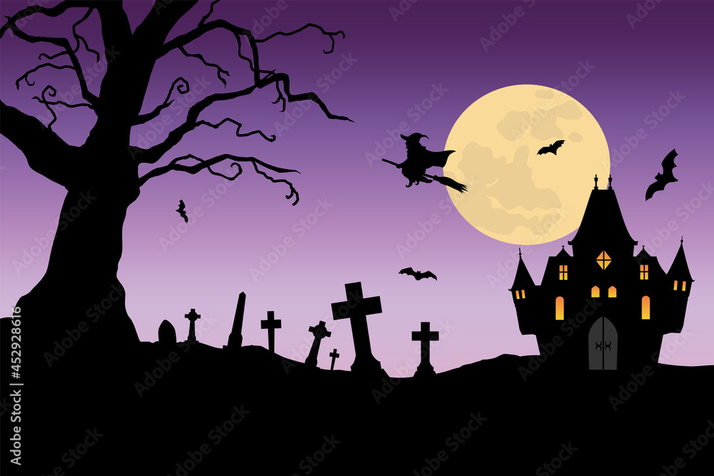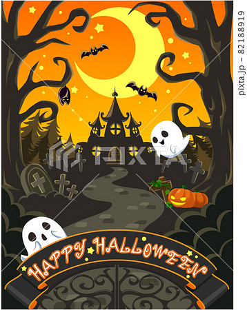 ハロウィンの背景にお化け屋敷、墓、森、満月のイラスト素材・ベクター Image 87049970。