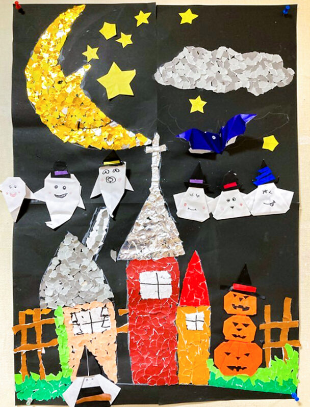 今日は子供会行事の企画としてちぎり絵講座を開催していただき、三連休の最終日に親子で楽しくハロウィンのテーマでちぎちぎしました!100色折り紙の中から好きな色を選んで、好きな形、好きな配置で、こうして並べてみるとそれぞれ個性的でとってもカラフルに、そして。