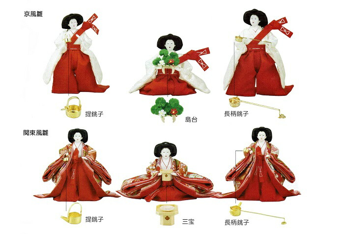 三人官女の並べ方と持ち物 – 真多呂人形博物館。