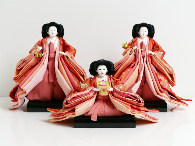激安特価雛人形在庫処分 華やかさが自慢の金彩衣装の三人官女が安い 雛人形~広島市の人形問屋十二段屋。